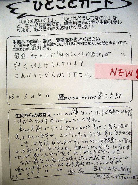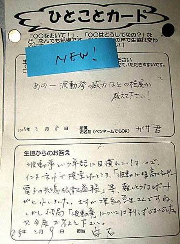 ・ ソーテック、無料PC提供サービス 「タダパソ」 開始―Bフレッツ加入で (ITmedia) ・ 保育園児の4人に1人がネットを利用:米調査報告 (Hotwired) ・ PCの脆弱性を偵察するワーム、セキュリティ専門家らが警戒 (CNET Japan) ・ gooの検索エンジンがゲーム検索機能を強化。新作チェックなどが簡単に (RBB TODAY) ・ 『強殖装甲ガイバー』 アフレコ開始! 先行特番も放送決定! (eg) ・ 新時代のタツノコヒーロー「鴉-KARAS-」 ついに降臨! (eg) ・ 小倉優子さん:魔法使いのコスプレで応援 ローズオンライン発表会 (毎日新聞) ・ 「もっと勉強しておけば」 中高生7割後悔 ベネッセ調査 (朝日新聞) ・ クラゲで 「癒やし」 新江ノ島水族館のお泊りツアー人気 (朝日新聞) ・ ベルリンの至宝展、33万人集め閉幕 7月から神戸市で (朝日新聞) ・ ハゲは母方から遺伝 独の研究チームが有力遺伝子発見 (朝日新聞) ・ パンダで台湾統一攻勢 中国、名前公募で準備着々 (産経新聞) ・ 空から氷塊、屋根突き破る 航空機から? 栃木・佐野 (産経新聞) ・ 暑いので…クウェートで“労働禁止令” (産経新聞) ・ ファン大興奮!「真下正義」シリーズ化へ交渉成功 (サンスポ) ・ 米日系ストアで日本オタクと仲良くなろう (ExciteBit) |
